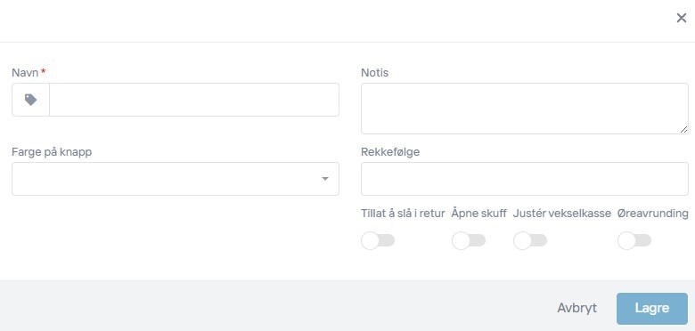 | Åpne skuff | Aktiverer at kasseskuff åpnes hver gang betalingsmetoden brukes |