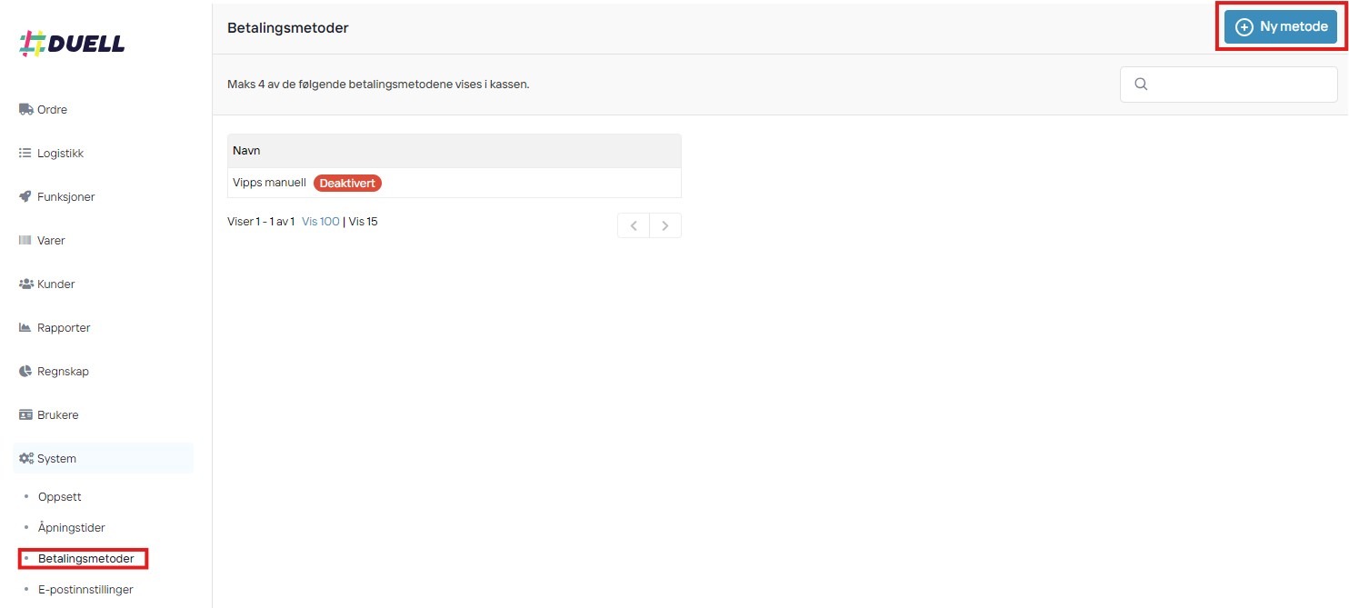 Logg på DUELL Admin og gå til > System > Betalingsmetoder
