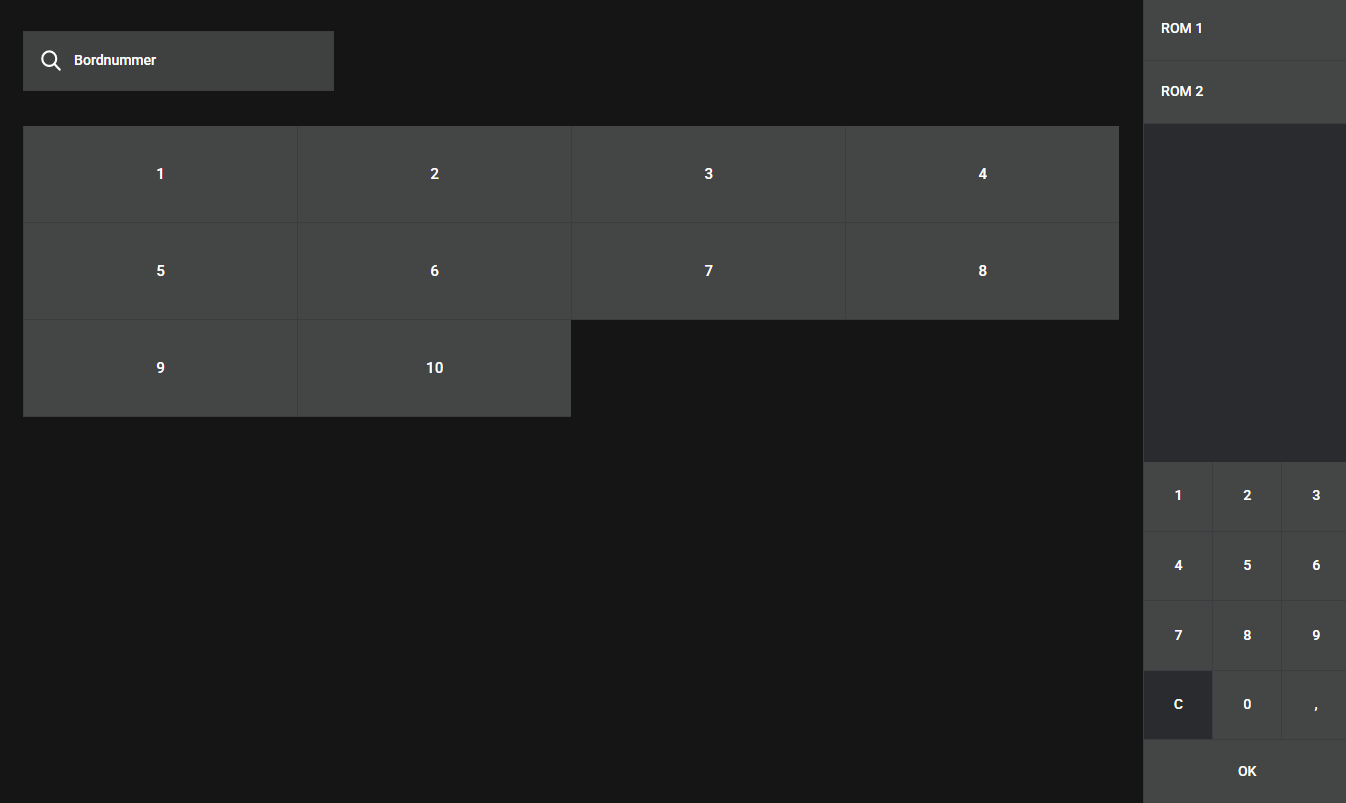 Vi skiller mellom rom og bord. Rommene står fast på skjermen i kassen og inneholder bordene. Knappene som vises vil avhenge av hvilket rom som er valgt. Det kan opprettes inntil 12 rom med inntil 24 bord i hvert rom.