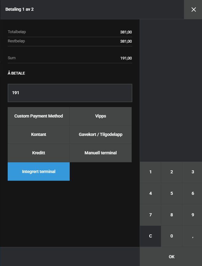 5. Trykk OK for å gjennomføre salgene. Du vil få opp hvor mange betalinger som gjenstår inne på betalingsvindeuet.