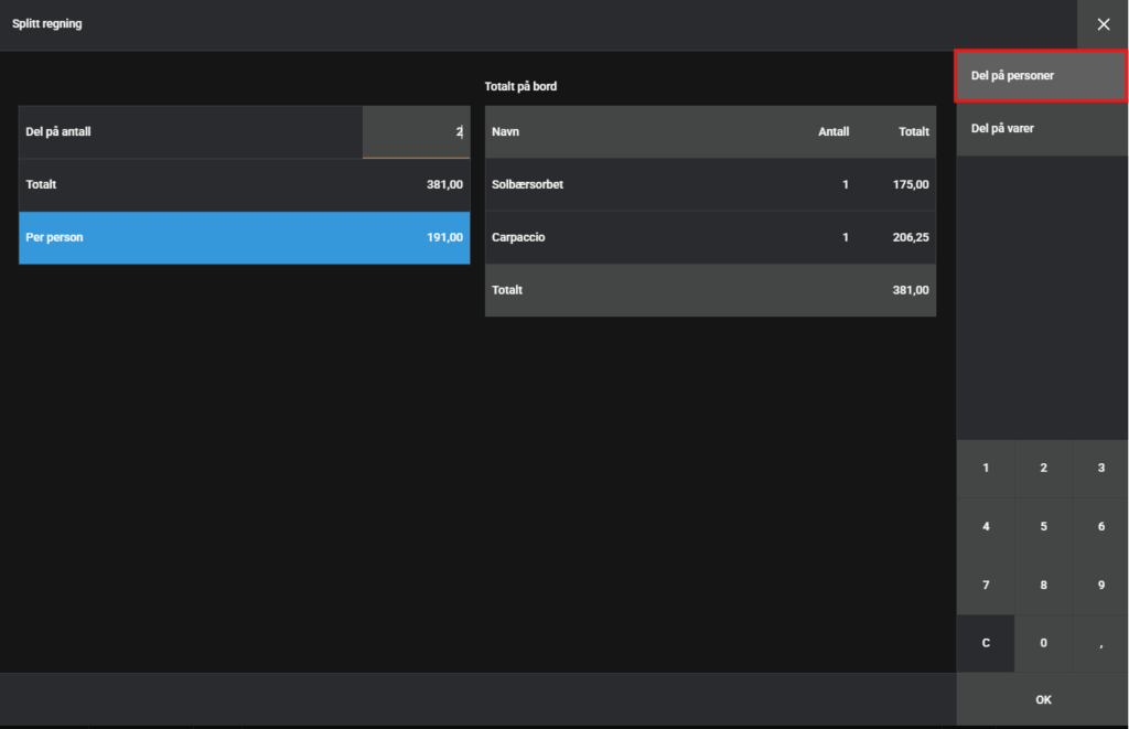 4. Velg mellom å dele på personer eller dele på varer