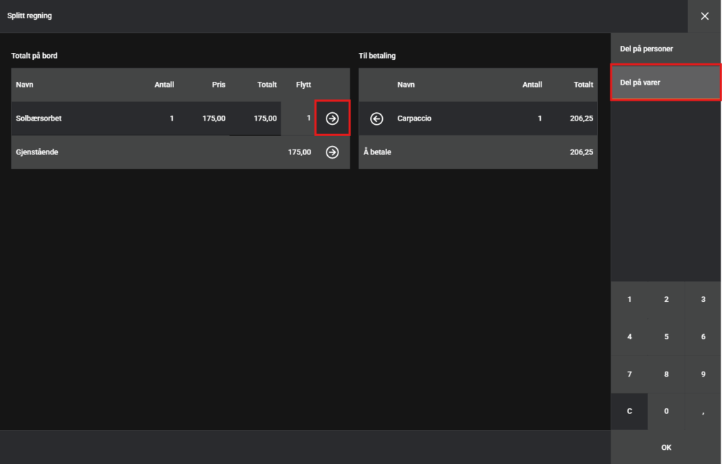 4b. Del på varer. Her trykker du på pilen ved varen for å velge å legge den til betaling.
