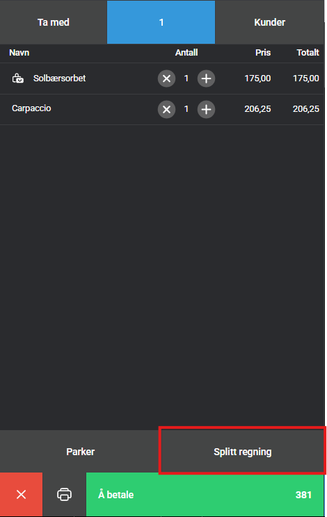 3. Du vil nå få opp salget i handlekurven, hvor du kan trykke på Splitt regning over betalingsknappen.