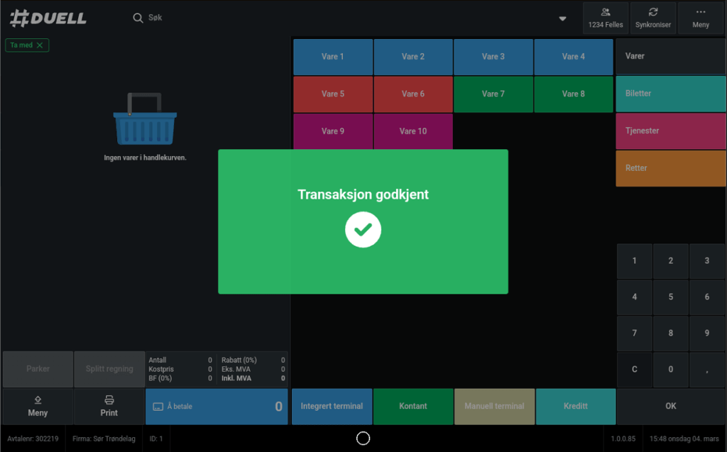 Når et terminalsalg er godkjent, vil du se et grønt avhukk på skjermen. Denne vises også på kundeskjermen. Hvis du har skrudd på at kvittering skal komme for hvert salg, vil du også kunne se det stå «Autorisert» eller «Godkjent» på kvitteringen. Handlekurven tømmes også på godkjent salg.