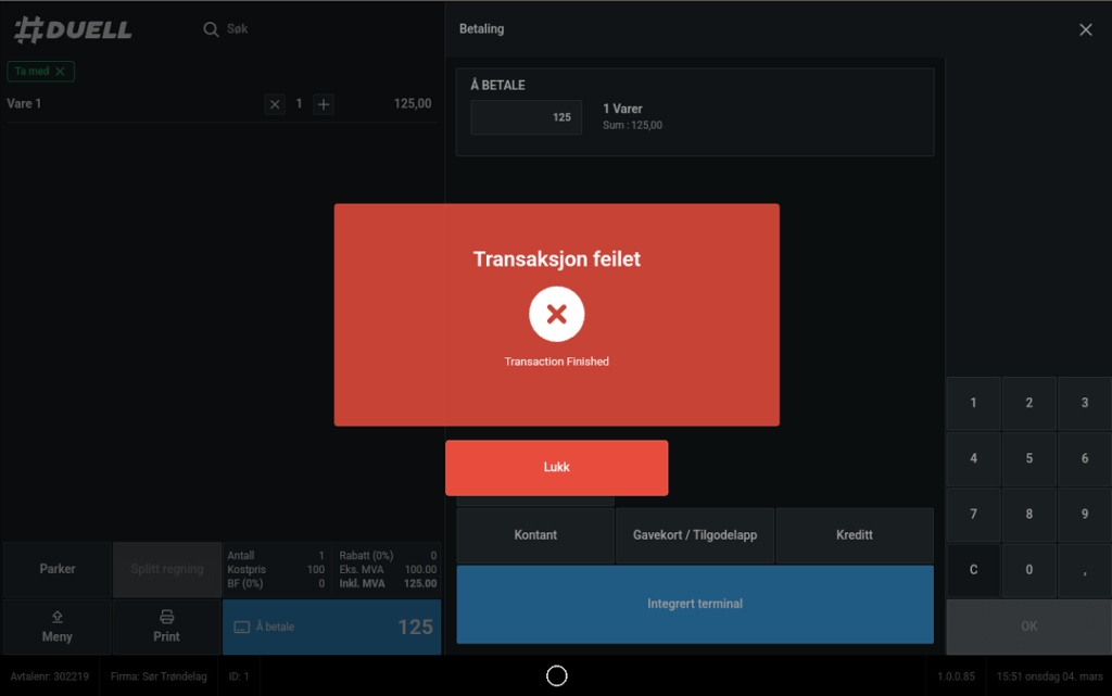 Hvis salget ikke ble godkjent, vil du se et rødt kryss på skjermen. Denne vises også på kundeskjermen. En kvittering vil automatisk bli skrevet ut når et salg er avvist, og du vil kunne se på den at det står «Ikke Autorisert» eller «Ikke Godkjent». Når salget er avvist tømmes ikke handlekurven, og du vil få muligheten til å velge hvilken betalingsmetode neste forsøk skal prøves på.