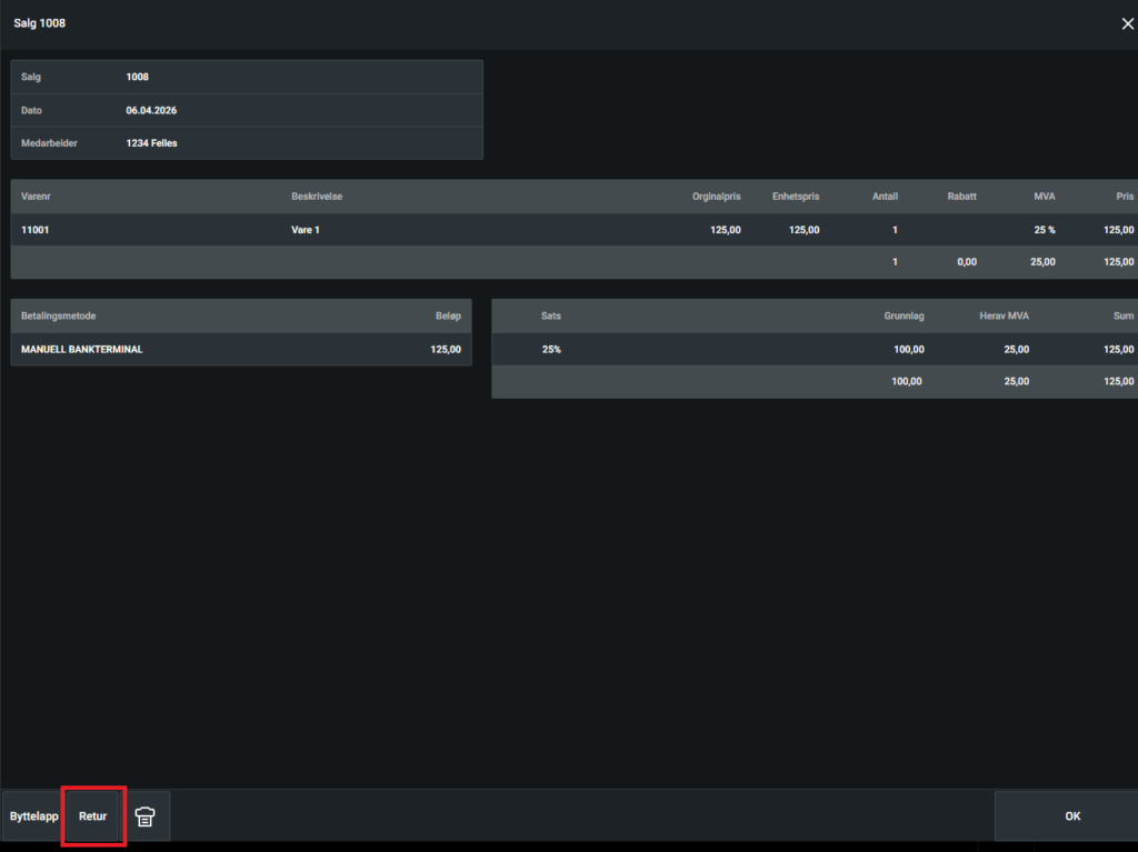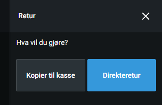 Direkteretur brukes når hele salget skal returneres til samme sum som ved betaling. Du vil få valget mellom forskjellige betalingsmetoder for retur av kjøpesum.