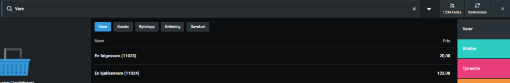 Søkefunksjonen i kassen er et kraftig verktøy som hjelper deg med å finne varer og tjenester for salg. Søkeresultatene viser også lagerbeholdning og salgspris.
