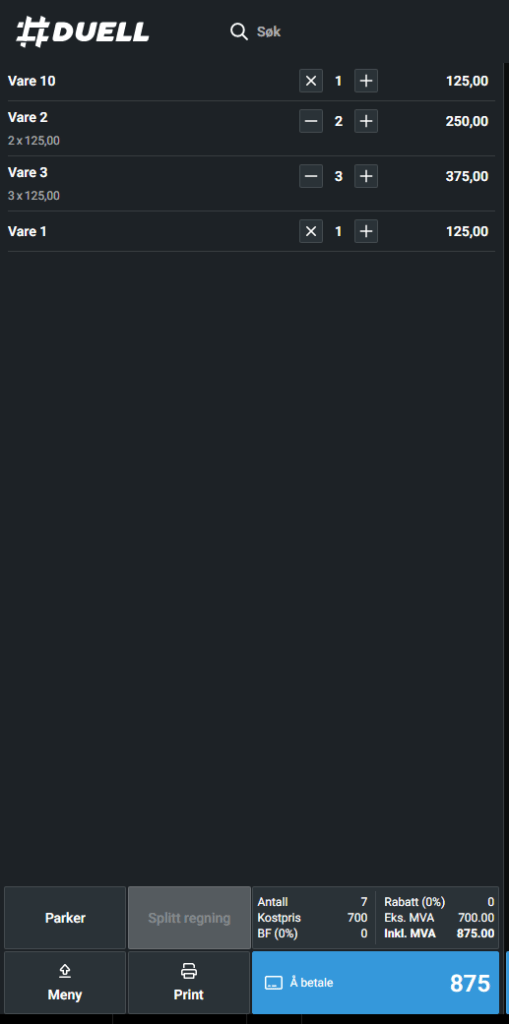 Klikk på +/- på varelinjen for å justere antall av varen.