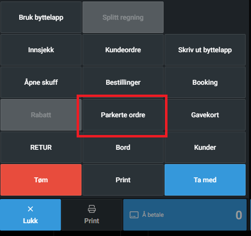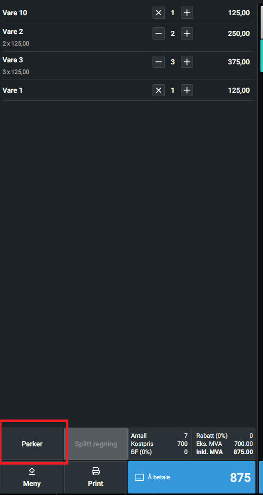 Noen ganger har kunden glemt kortet i bilen eller kanskje ikke fått med seg alle varene til kassen og da ønsker man å kunne parkere betalingen og ta neste kunde i mellomtiden.