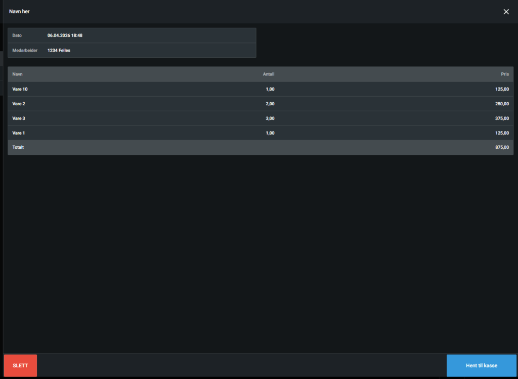 Alle parkerte ordre kommer opp i en liste nedover. Har du flere kan du bla nedover eller søke opp navnet. Når du finner den rette ordren trykker du på den. Du får da valget om å hente til kassen eller slett.