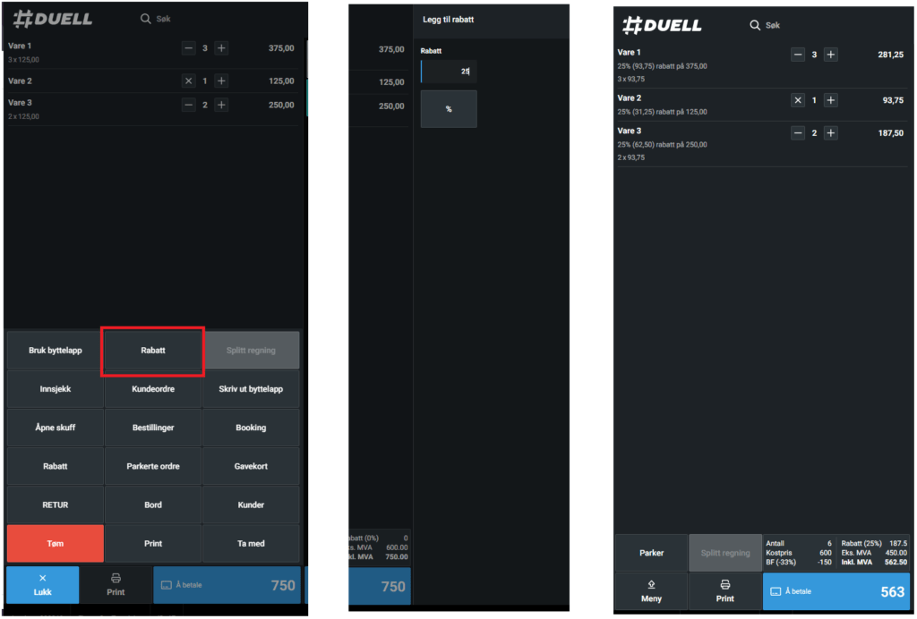 - Etter varer er lagt til i handlekurven, trykk på Rabatt-knappen i Meny nederst til venstre.