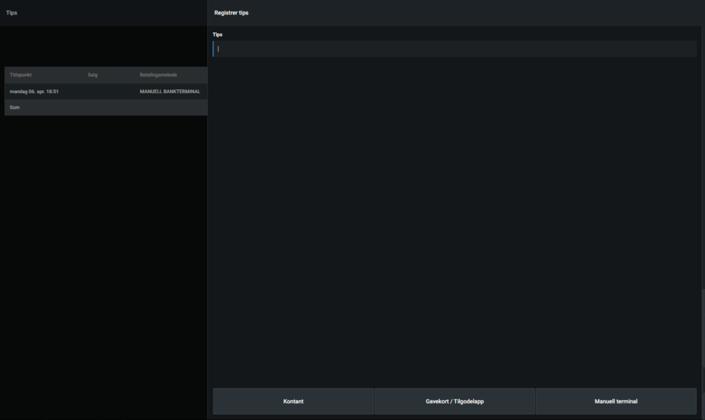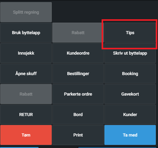 Om du ønsker å registrere tips utenom et salg, kan du trykke på Tips-knappen i Meny knappen nederst til venstre på kassen.