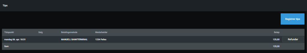 Så lenge tips er aktivert på terminalen, vil kunden bli bedt om å skrive inn totalbeløpet de ønsker å betale. Beløpet som går over totalbeløpet vil bli registrert som tips.