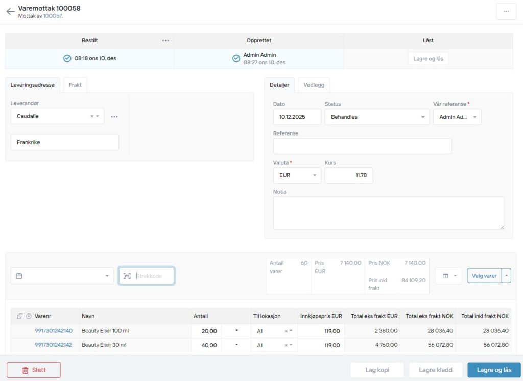 Du finner nå kladden i Logistikk > Varemottak inne i Duell Admin, hvor du kan lagre og låse den.