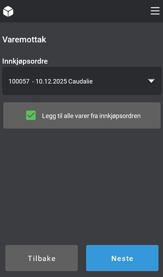 Om du skal opprette varemottak fra en innkjøpsordre, velger du innkjøpsordren fra menyen. Du kan også huke av for Legg til alle varer fra innkjøpsordren slik at det går enda raskere.