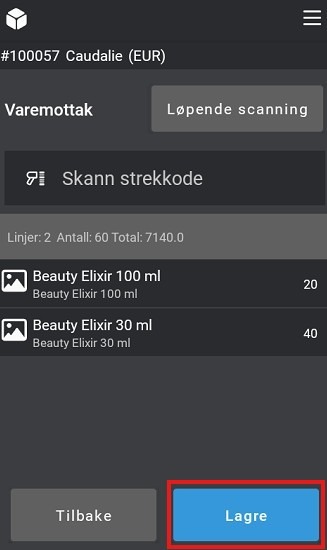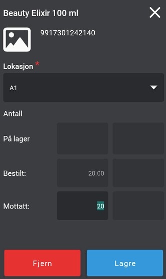 Du kan endre antall for hver vare dersom du mottar mer eller mindre enn det som står i innkjøpsordren. Dette gjør du når du legger til varen manuelt ved å skanne, skrive inn varenummer/varenavn eller ved å trykke på varelinjen det gjelder.