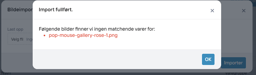 Om bildene ikke blir lastet opp, vil du få en oversikt over hvilke filer dette gjelder. Vanligvis vil dette være grunnet varenavn som ikke matcher varenummer til en eksisterende vare.