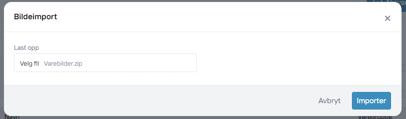 Du får nå opp et vindu hvor du kan laste opp en komprimert Zip-fil med bilder til varene. Det er viktig at bildene har varenummer som filnavn.