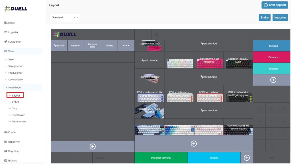 Logg på DUELL Admin og gå til Varer > Innstillinger > Layout.