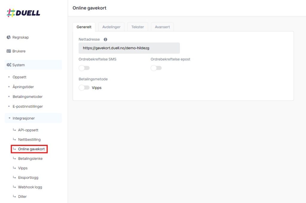 For å sette opp innstillingene for gavekort, logger du inn i DUELL Admin og går til System > Integrasjoner > Online Gavekort.