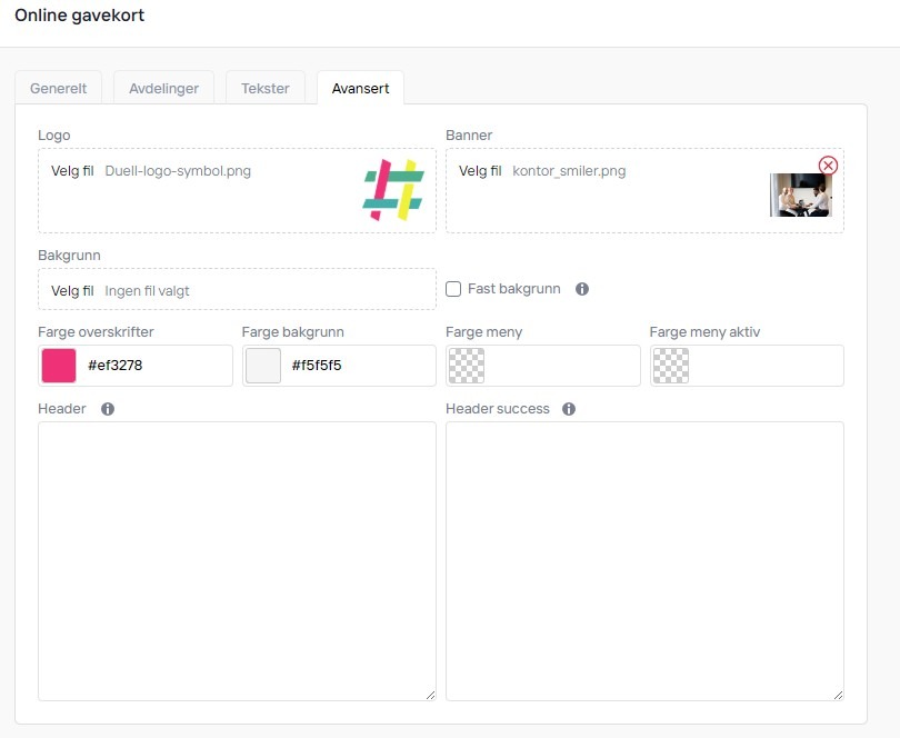 Avansert-fanen lar deg tilpasse designe av siden samt legge inn sporingslenke i banner om ønskelig.