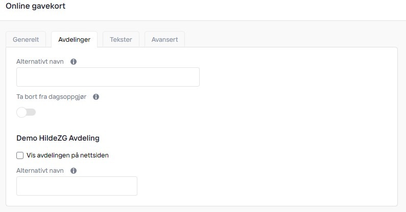 Under fanen Avdelinger kan du velge alternativt navn for siden eller per avdeling. Du kan også velge om gavekortet skal regnes med i dagsoppgjøret eller ikke.