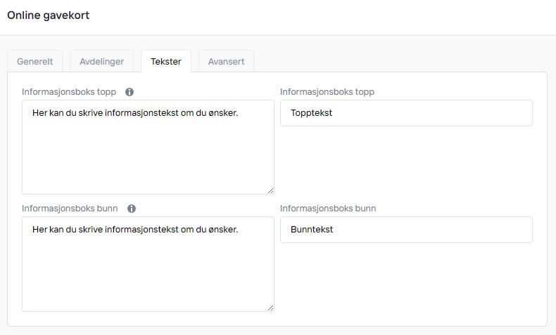 Under fanen Tekster kan du legge inn ønsket informasjonstekster. Informasjonsboks Topp vil dukke opp før bestilling av gavekort, mens Informasjonsboks Bunn dukker opp under bestillingen.