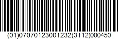 En GS1-128 strekkode ser for eksempel slik ut: (01)07070123001232(3112)000450